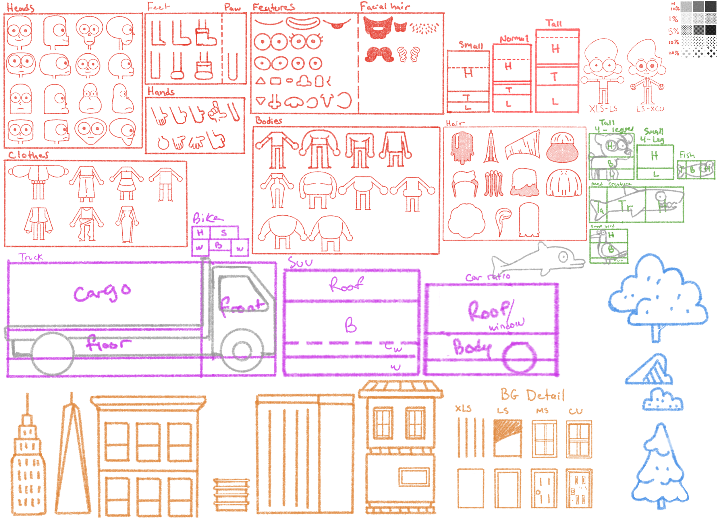 But I’m getting ahead of myself. To start, the purpose of a style sheet is to ground the aesthetic language so you can reference it for later. You want something that you can refer back to as time goes on, because you will develop and improve, get bored, or just slowly change. This sheet helps you keep things consistent and if you plan it well, you can account for much of the creative process before you go into production which helps stop the style drift even more.