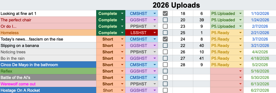 It’s possible that some of the shorts might be re-arranged, depending on real-world circumstances; however, I like this schedule a lot so far. The first half of 2026 contains the continuation of my current series: